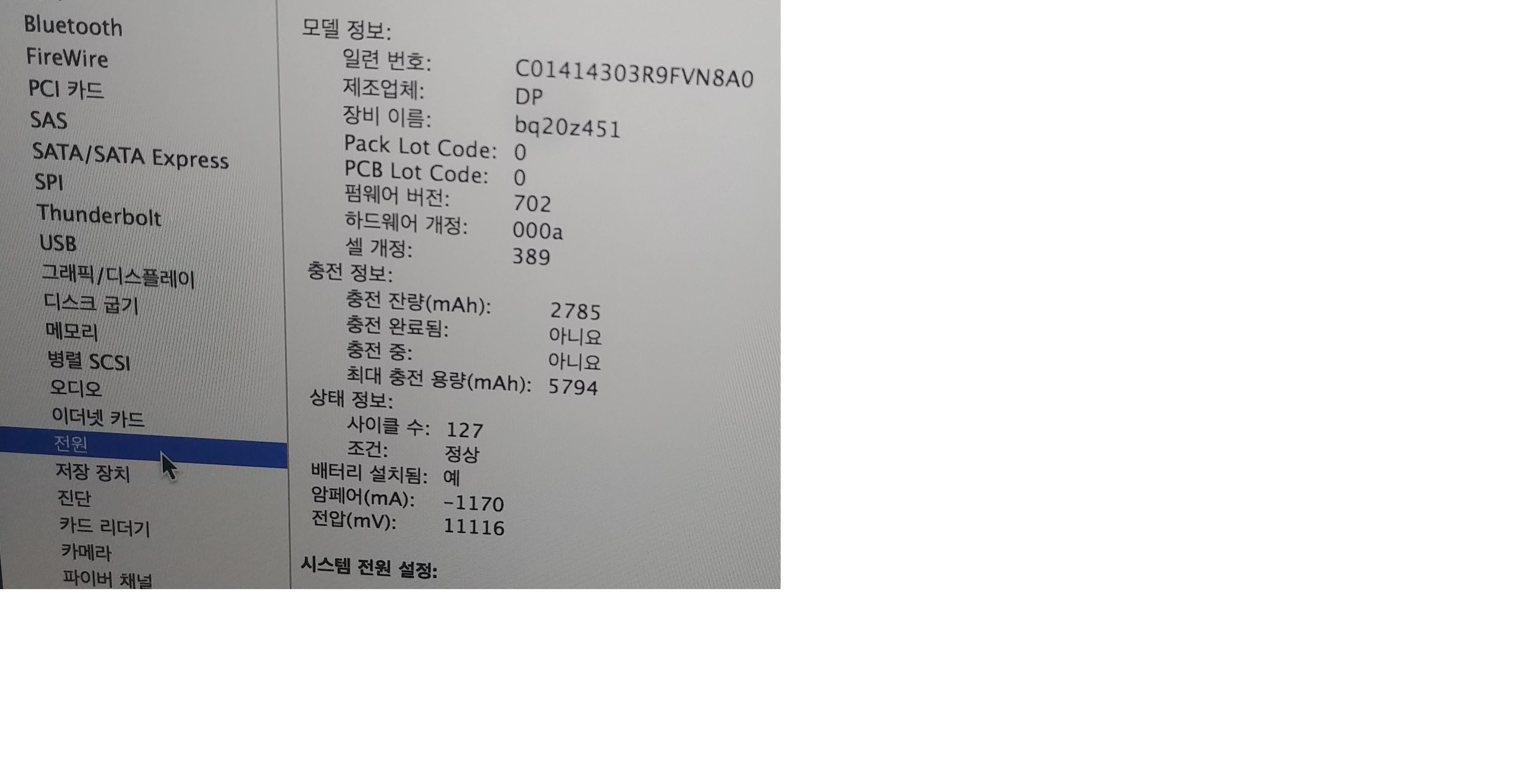 배터리 사이클 127  최대충전용량 5794